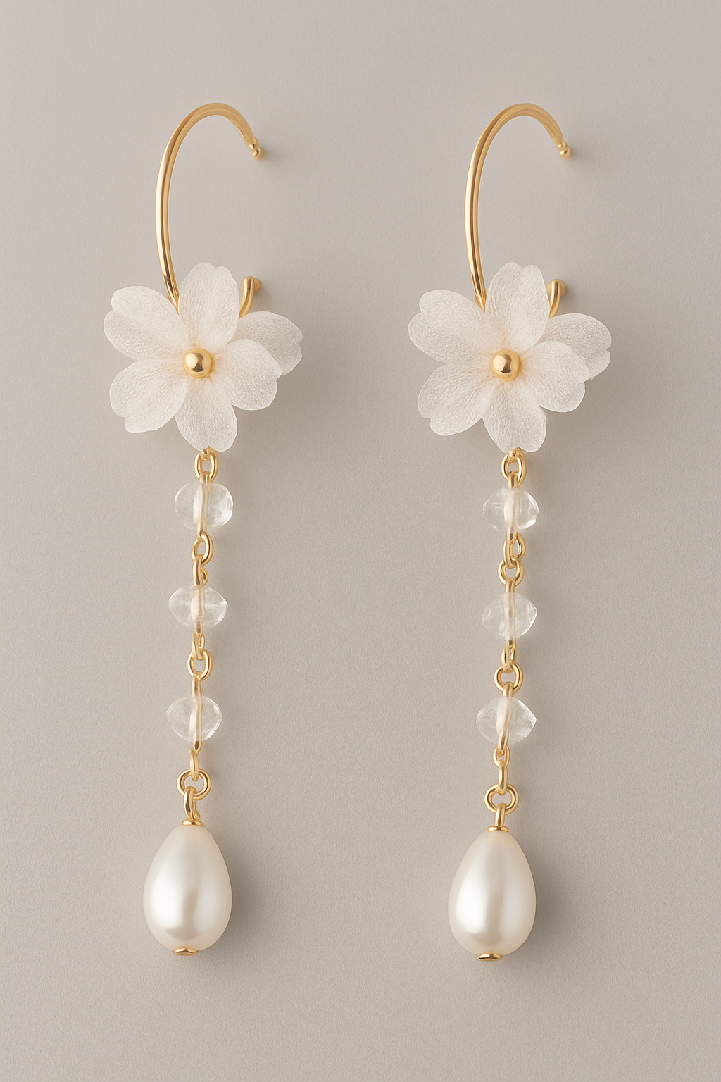 Add a touch of timeless beauty to your accessory collection with these Floral Pearl Drop Earrings. Designed with a refined gold-tone hoop, these earrings feature a soft fabric flower centerpiece that exudes feminine charm. Dangling beneath are crystal-clear faceted beads and a teardrop-shaped faux pearl, creating a beautiful cascading effect that catches the light with every movement.